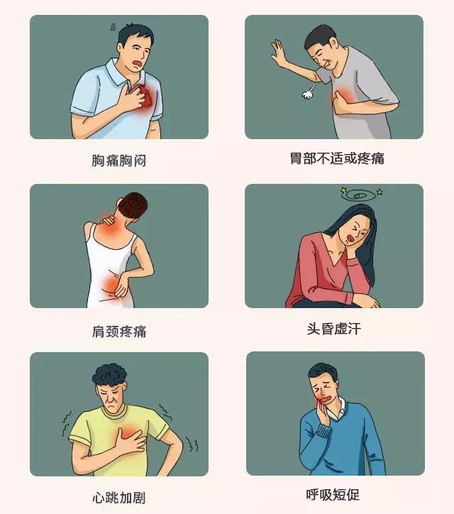 其他最常见症状为大汗、乏力、恶心、呼吸短促、肩颈部放射性疼痛、心悸及胃部不适或疼痛。 常见诱因